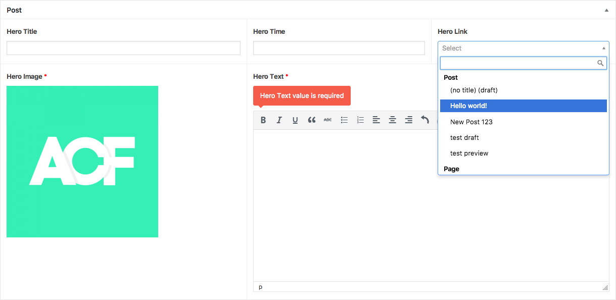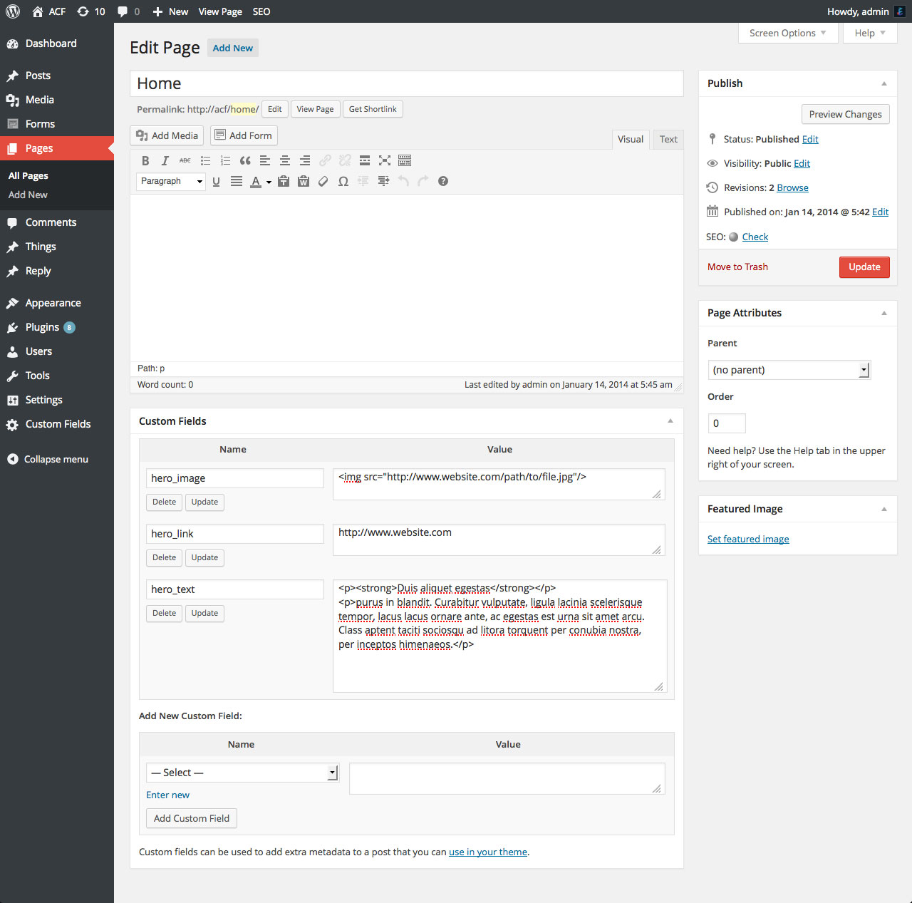 Custom fields are a native part of WordPress and appear on pages, posts and custom post types, however, the native custom field interface is not very user friendly. With ACF installed, you can tailor what fields to show and what they look like. For instance, you may require a ‘Hero Image’ to be selected for your home page. You can use ACF to easily create this Image field and show it when editing the home page! Here is the difference between native custom fields and Advanced Custom Fields.
