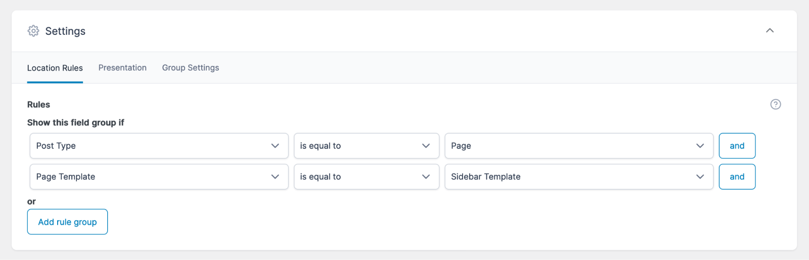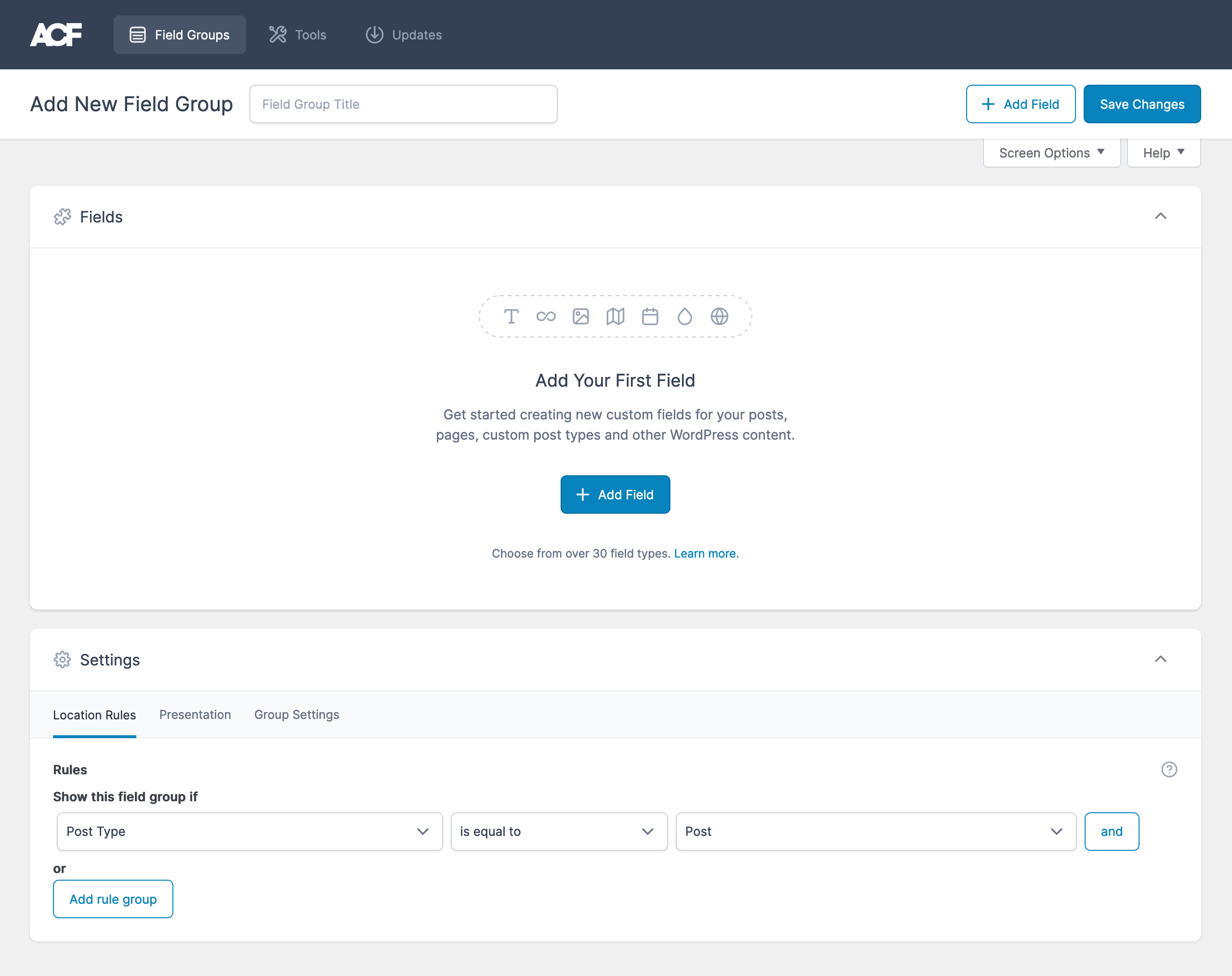 Field groups are used to organize fields and attach them to edit screens. Each field group contains a title, fields, location rules and visual settings. To get started with your first field group, please read our Creating a Field Group guide.