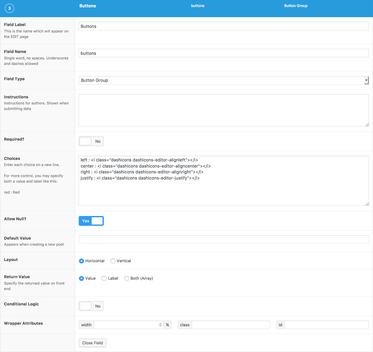The choices displayed when selecting a value. Enter each choice on a new line (eg. Red). For more control over the value and label, you may use a colon to specify both (eg. red : Red). You may also enter HTML as a choice as shown in the above screenshots.