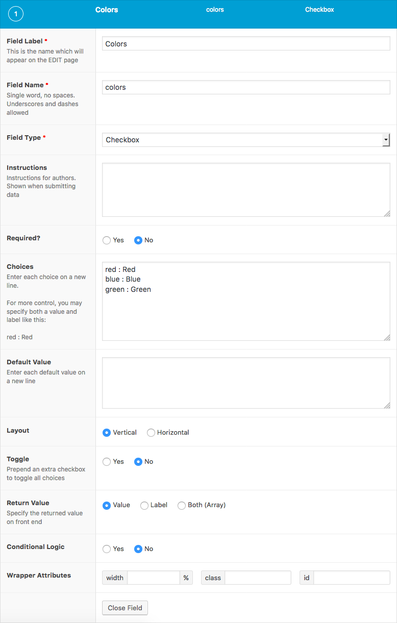 The Checkbox field creates a list of check-able inputs.