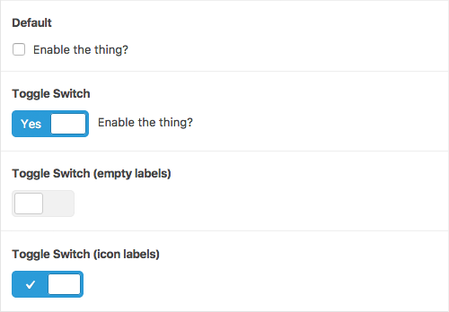 The text displayed within the stylized toggle switch. Defaults to ‘Yes’. HTML may be entered for icons or custom markup.