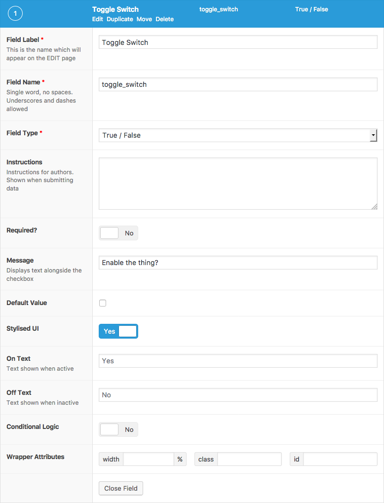 The True / False field allows you to select a value that is either 1 or 0.