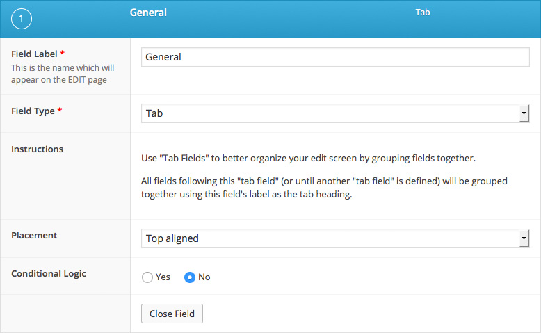 When editing a field group, be aware that all fields following the Tab field (or until another Tab field is defined) will be grouped together using the Tab field label as the tab heading.