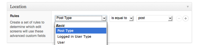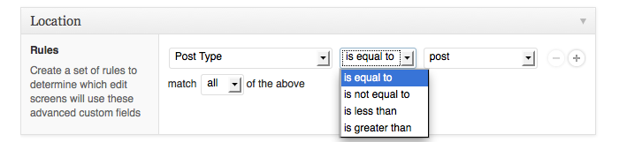 This step is optional and not required for your custom location rule to work. When editing a field group, the ‘operators’ drop down is the second dropdown in the location rule row.