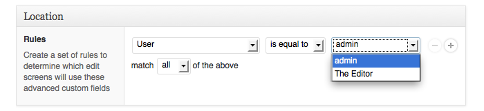 Each field group contains a set of location rules. These rules are used to decide where to show the field group throughout the WP admin. It is possible to create your own location rules, or even modify existing rules using the following filters.